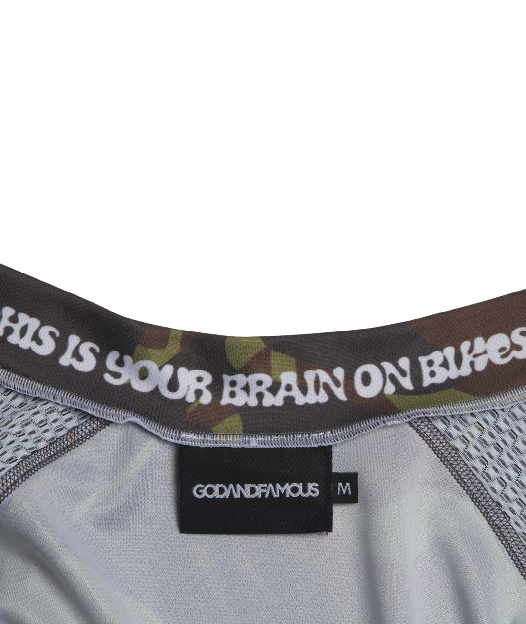This is your brain on bikes. A multi-material race cut, short-sleeve cycling jersey with ultra light mesh side panels and over easy 😓 print pattern. Features a YKK #3 hidden zipper, 3 rear pockets and sewn-on woven labels throughout.